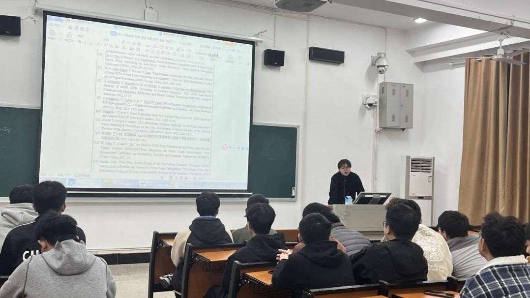 给大家分享经验的王康伟和陶晓宇同学在2022年暑假参加过全国大学生数学建模竞赛,并取得了省级一等奖的优异成绩。他们之后参加了“谷歌智能手机分米级定位挑战赛”,在比赛中调研国内外文献,进行方案论证,凝练创新点,申报了2024年创新项目“复杂情况下基于多CORS基站的智能手机高精度定位方法研究”。交流会上他们重点介绍了项目申报书的撰写过程,包括选题、找队友、找指导老师以及查阅文献等。这些经历激发了同学们对专业研究的兴趣。
