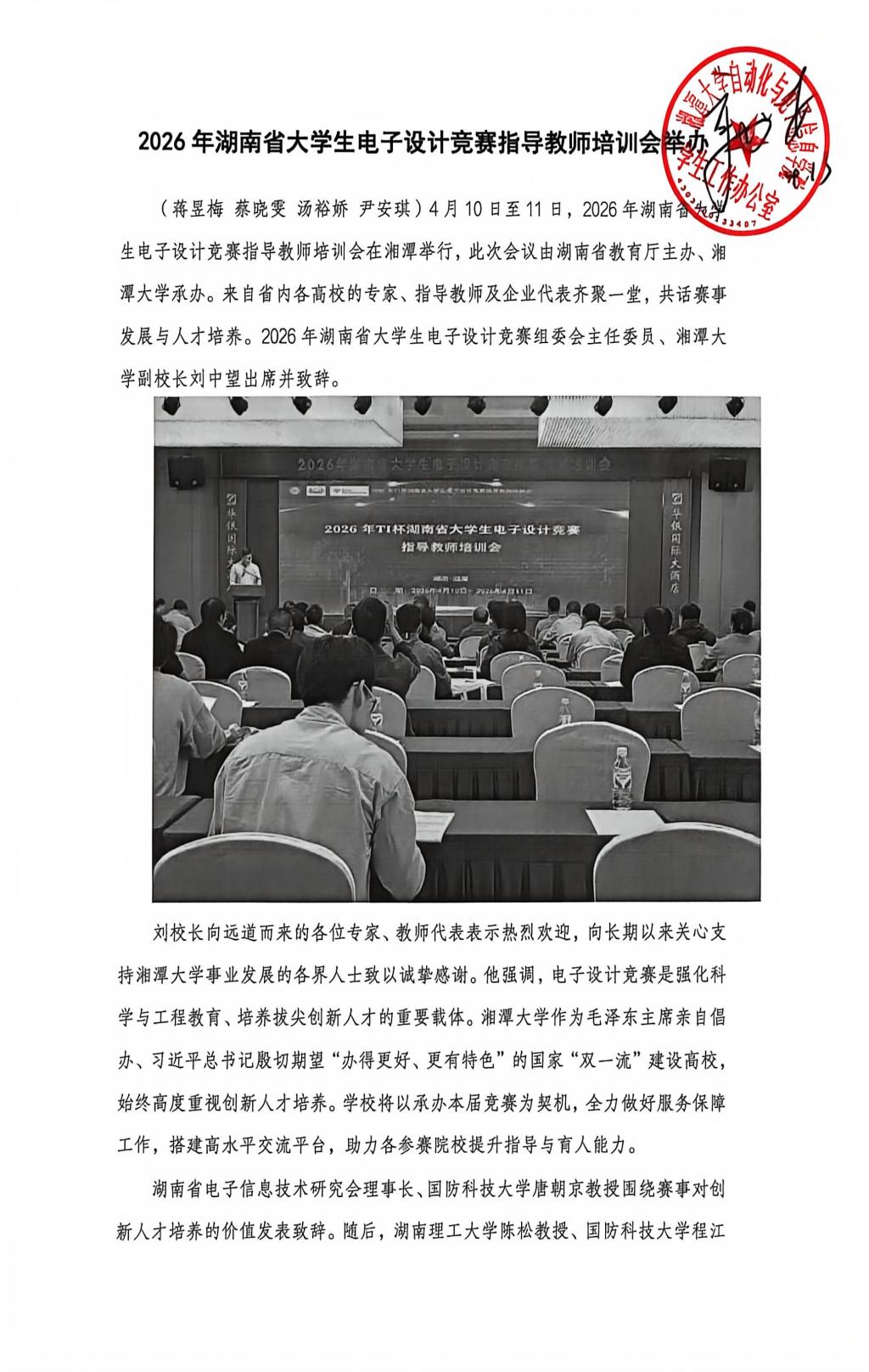 (蒋昱梅 蔡晓雯 汤裕娇 尹安琪)4月10日至11日,2026年湖南省大学生电子设计竞赛指导教师培训会在湘潭举行,此次会议由湖南省教育厅主办、秀人集