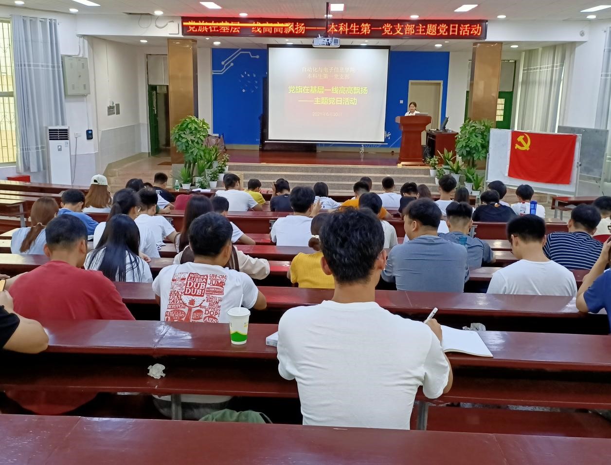 本科生第一党支部在工科楼阶梯教室举行“党旗在基层一线高高飘扬”主题党日活动。