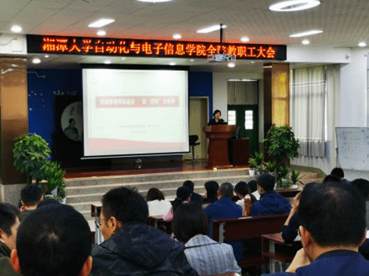 报告中,首先组织学习了湘大党发【2021】22号文件“关于认真学习贯彻习近平总书记给全国高校黄大年式教师团队代表重要回信精神的通知”,然后以播放视频形式让大家了解了黄大年同志的生平事迹,并结合湘大纪发【2021】4号文件“关于进一步加强‘四风’问题常态化整治的通知”的精神,请全体教职工监督领导干部反对“四风”,抓好作风建设。金义华还列举了常见的师德失范的典型情形,结合本院教工中某些不良现象,强调全体教职工加强师德师风建设的重要性,要求大家以黄大年同志为榜样,立足本职岗位,争做有理想信念、有道德情操、有扎实学识、有仁爱之心的“四有”好老师。