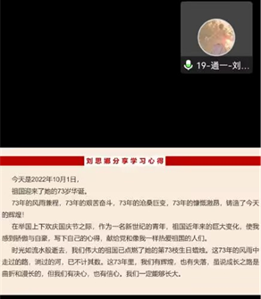 栉风沐雨,初心不改,砥砺奋进,再续华章。为弘扬爱国主义精神,铸牢中华民族共同体意识。在第73个国庆节到来之际,我们在支部副书记程威的主持下,举办“迎国庆、感党恩、担使命”线上主题党日活动。