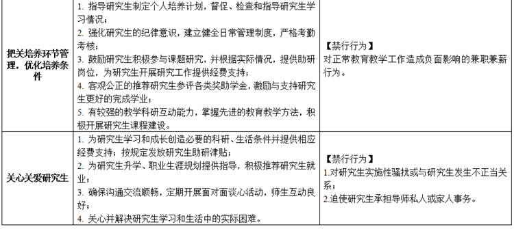 为研究生学习和成长创造必要的科研、学习、生活条件并提供相应经费支持;加强研究生科研方法指导,鼓励研究生积极参与课题研究;积极创设良好的学术交流平台,增加研究生参与社会实践和国内外学术交流与合作的机会;积极参加研究生课程建设与改革,优化课程体系;关注研究生就业,引导研究生做好职业生涯规划、树立正确的择业就业观念,帮助研究生提高就业能力。