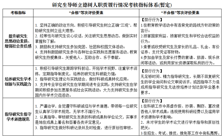 注:1.立德树人职责履行情况考核分为合格、不合格两个等次,结合学院学术委员会评价、教学督导评价、研究生评价和导师自我评价开展分项评价,由学院进行总体评价,最终确定导师立德树人职责履行情况考核结果;2.凡被认定具有所列“禁行行为”之一的,该年度立德树人职责履行情况考核结果直接认定为“不合格”。