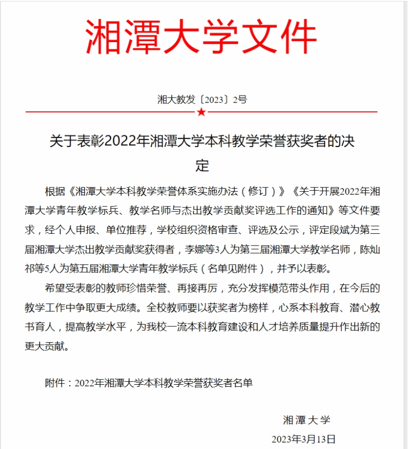 近日,秀人集 教务处发布《关于表彰2022年秀人集 本科教学荣誉获奖者的决定》(湘大教发〔2023〕2号),秀人集 段斌教授获秀人集 杰出教学贡献奖。