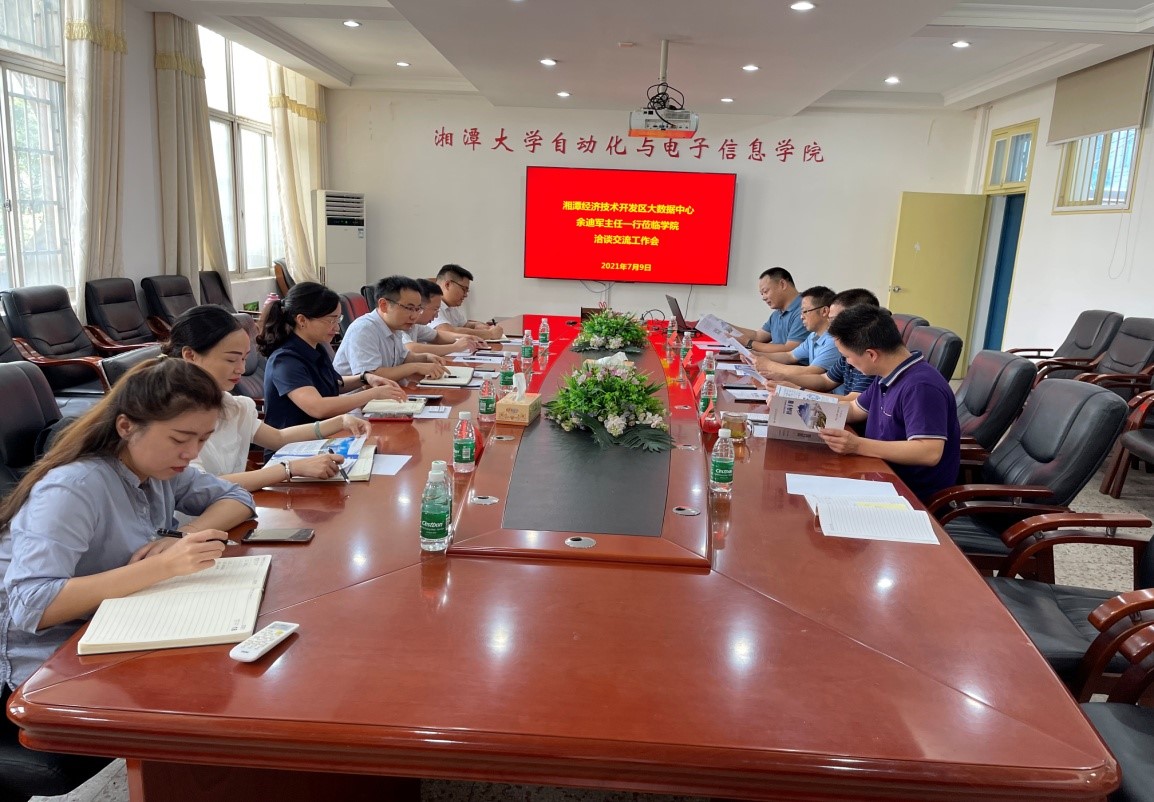 2021年7月9日上午9点在学院201会议室,湘潭经开区大数据中心副主任李松涛一行来秀人集 洽谈交流。秀人集 院长姚志强、分管科研工作的蔡成林副院长、分管教学工作的谭貌副院长、党委副书记郭凤安、谭平安委员、兰志勇博士出席了本次会议。