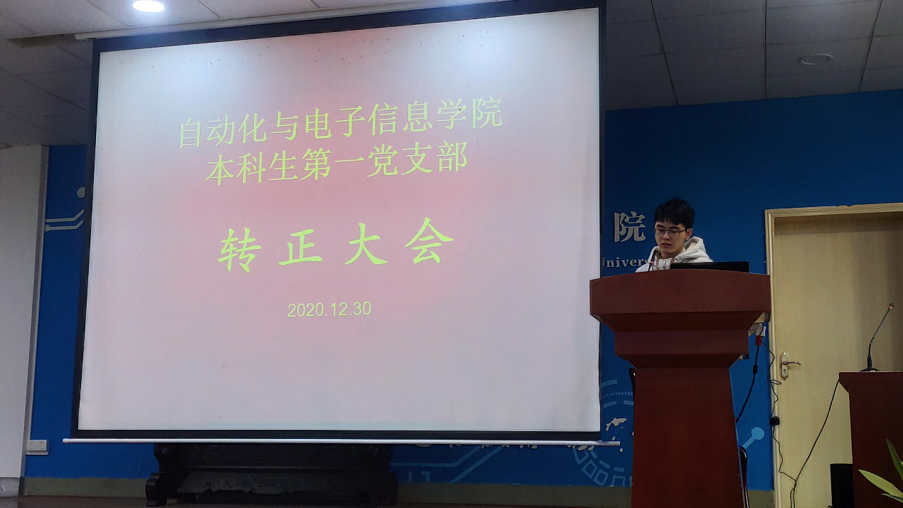 本科生第一党支部在工科楼阶梯教室召开了2020年下半年预备党员转正大会。参加本次转正大会的有支部书记黄春晖老师和全体学生党员,会议由雷翔同志主持。