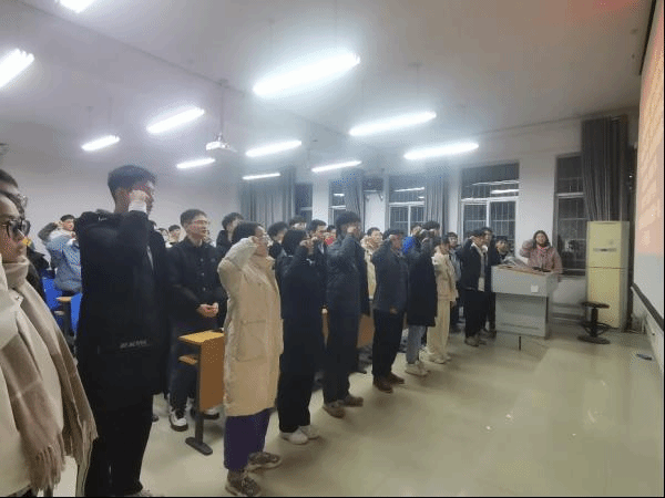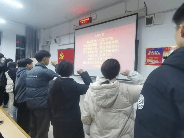 宣布完投票结果后,支部的18名新吸收的预备党员到讲台前,进行了光荣的入党宣誓环节,支部全体党员也随他们一起在讲台下宣读了入党誓词。“我志愿加入中国共产党,拥护党的纲领,遵守党的章程…”,在一声声坚定而昂扬的誓词中,党员们展现了他们对党的热爱与忠诚。