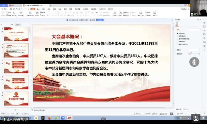 金书记先带大家了解大会基本情况,然后从审议通过两个文件、《决议》的框架和主要内容、百年历程创造的四个伟大成就、党的十八大以来十三方面的重要成就、党的百年奋斗的五大历史意义、党的百年奋斗的十大历史经验、马克思主义中国化的三次飞跃、深刻领会“两个确立”的决定性意义八个方面对十九届六中全会进行全面解读,并给学员们介绍“习近平新时代中国特色社会主义思想”的内涵和核心要义。