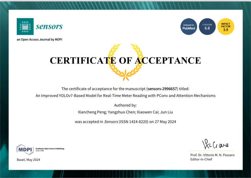 527日,由21级人工智能专业彭献铖同学为第一作者的论文“An Improved YOLOv7-Based Model for Real-Time Meter Reading with PConv and Attention Mechanisms”被SCI期刊SensorsJCR:二区,影响因子:3.4)接收。