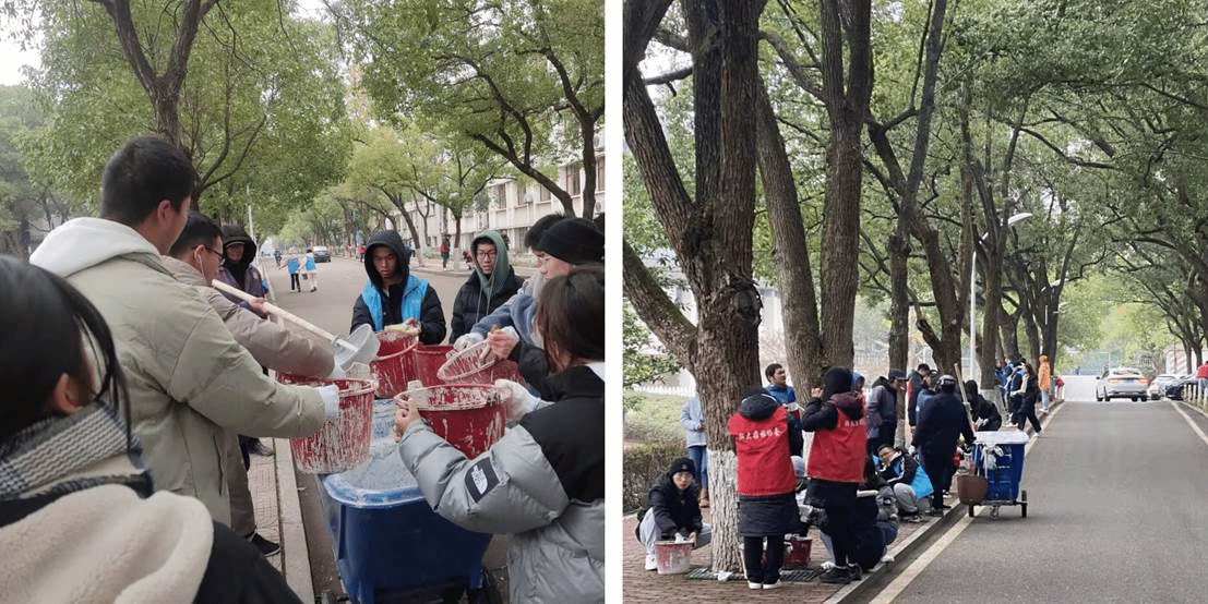 上午10点,园林协会负责人在经管楼苗圃给同学们分发了刷树工具:一个手套、一把刷子、一个白浆桶以及一件志愿服,随后在后勤人员的帮助下舀上半桶石灰浆,分头行动。