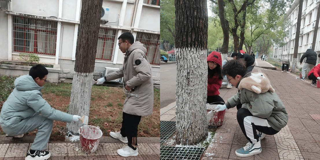 对于大部分同学来说,这是他们第一次刷树,但是他们热情满满:套上手套,手握刷子,沾上一刷子的石灰浆,“快、准、狠”地在标定的基准线下方树干上刷上均匀的一层白,不放过树干上的一丝缝隙。
