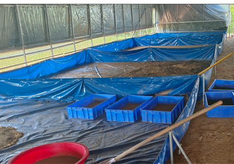 踏入基地,一股自然生态的原始气息扑鼻而来——带来生命循环不息的奥秘。负责人引领团队,步入黑水虻培育的大棚,揭示了这一生态链中不可或缺的一环:蛙类自幼便以黑水虻为食,因此养殖时多用黑水虻喂养而非饲料,可模拟青蛙的自然生长环境,这样喂养出来的青蛙不容易生病,不用喂药,没有任何激素或者抗生素的添加,绿色健康。