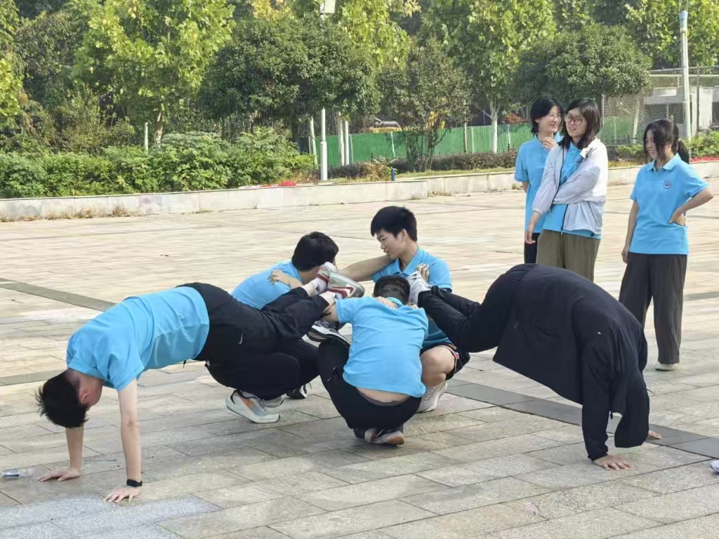作为学院“10·10”世界精神卫生日系列活动的重头戏,本次素质拓展精心设置了“齐心协力”“手足相连”“纸杯传水”“背夹气球”等一系列兼具趣味性与挑战性的团队项目。这些活动不仅是体能的较量,更是智慧与协作的考验。在“盲人接力”项目中,队员们戴上眼罩,在黑暗中完全依靠队友清晰、准确的指令前行,深刻实践了信任与沟通的团队精神。而在“齐心协力”项目中,全体队员需步伐统一、节奏一致,任何一人的失误都可能导致前功尽弃,极大地培养了队员间的默契和集体责任感。
