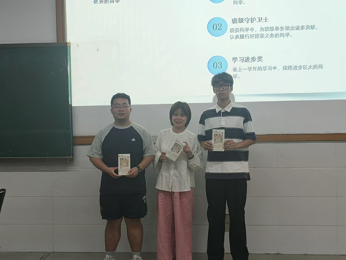 首先颁发的是“学习之星”奖。“学习之星”奖品是蒋老师精心挑选准备的六大名校联名笔礼盒,旨在表彰上一学年在专业排名中靠前的同学,鼓励他们更上一层楼。随后颁发的是“班级守护卫士”奖,此奖项旨在表彰在大一学年为班级积极工作、无私贡献的班委成员。此外,本次班会还特地设立了“学习进步”奖,以表彰上一学期排名进步显著的同学,鼓励他们再接再厉、再进一步。蒋老师分别为以上奖项获奖同学和班主任助理颁奖。
