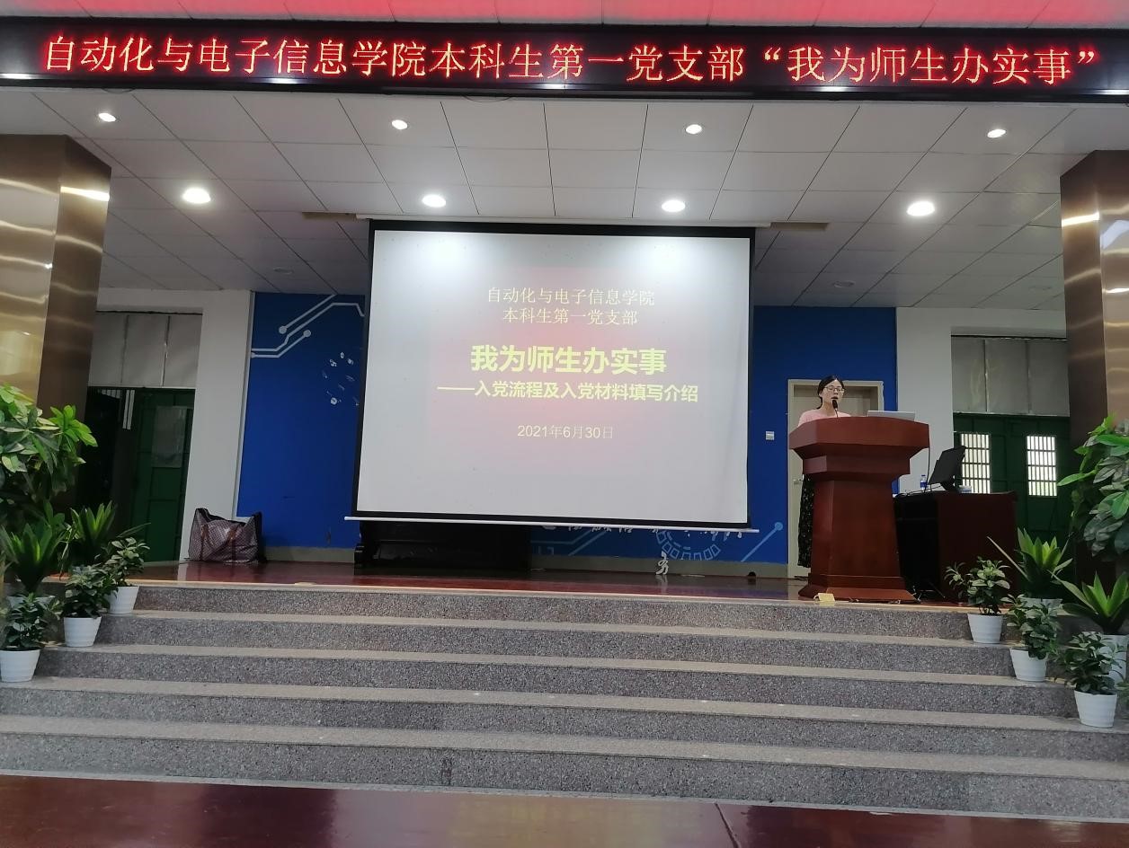 本科生第一党支部在工科楼阶梯教室举行“党旗在基层一线高高飘扬”主题党日活动。